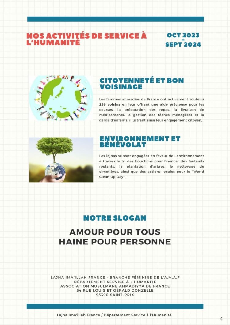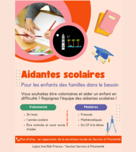 Inspirées par les nobles enseignements de l’islam, les femmes de la Communauté Musulmane Ahmadiyya de France s’engagent activement à soulager les souffrances humaines et à promouvoir l’amour et l’harmonie entre les individus, quelle que soit leur origine, leur culture ou leur croyance.